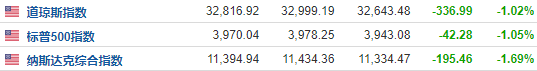 截至收盘,道琼斯指数跌1.02%,报32,816.92点;标普500指数跌1.05%,报3,970.04点;纳斯达克综合指数跌1.69%,报11,394.94点。