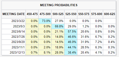 芝商所“美联储观察”工具显示,目前市场最主流的预测是该行将连续在3月、5月和6月各加息25个基点。另外,市场还预计美联储将利率全年维持在5.25%-5.50%的水平,抹去了昨日“12月降息25个基点”的预期。